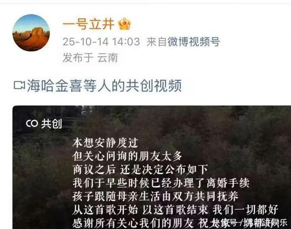 俩人一起发了离婚声明李亚鹏和海哈金喜一前一后在网上发了声明,说俩人已经把婚离了,手续都办利索了。会把这事儿说出来,主要是最近身边老有人追着问东问西,实在没辙了。他们就想安安静静过日子,也顺便告诉大家伙儿,俩人现在都挺好的,别瞎操心。